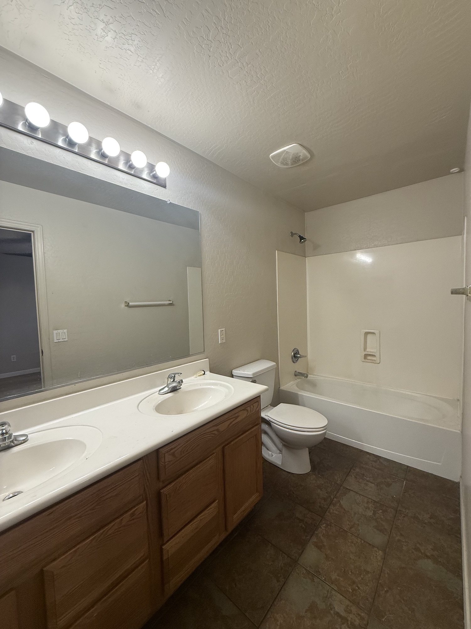 Upstairs bathroom with dual sinks and bathtub with shower |