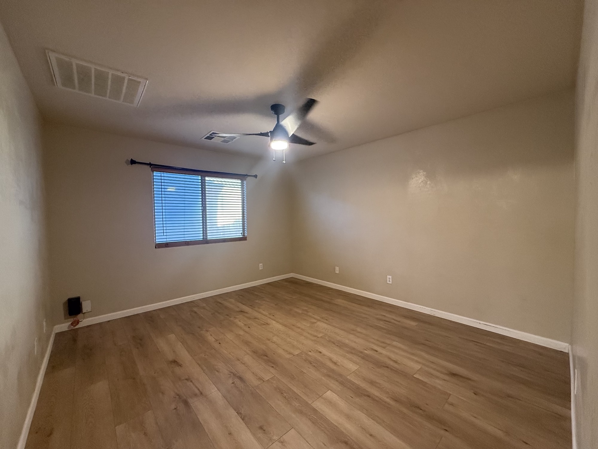 Downstairs living room, has ceiling fan for air circulation